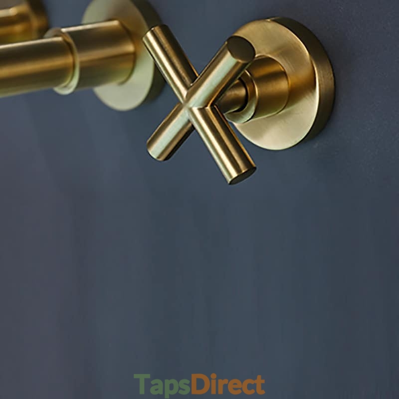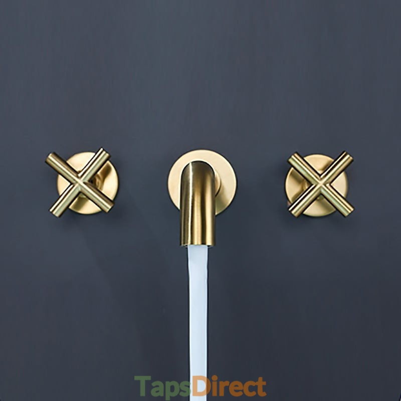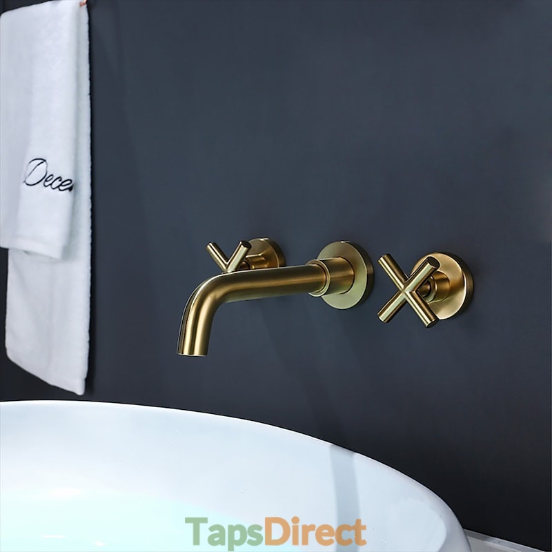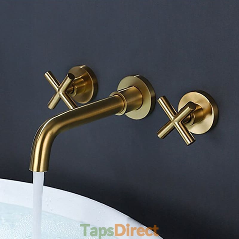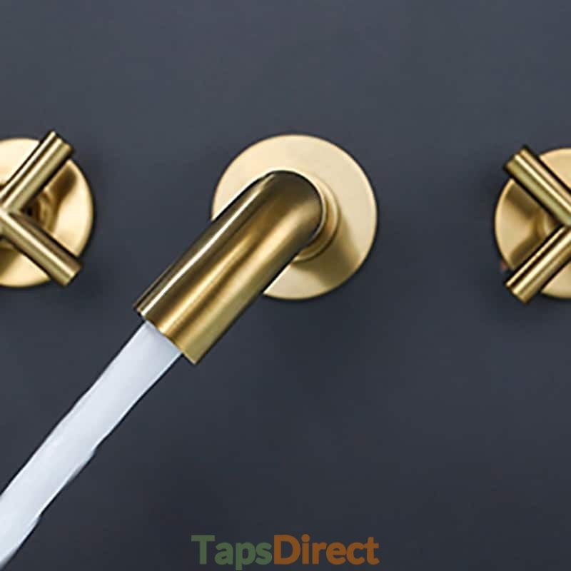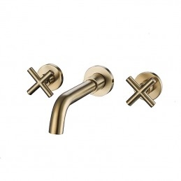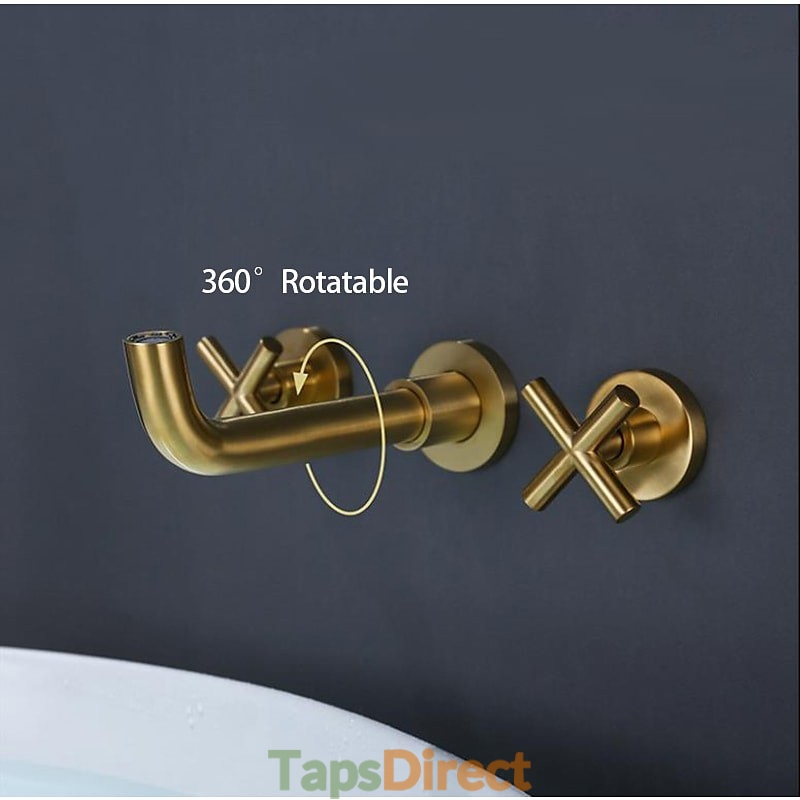 Style: Contemporary, Features: Wall Mount, Widespread, Faucet Type: Bathroom Sink Faucet, Installation Type: Wall Mounted, Number Of Handles: Two Handles, Cold and Hot Switch: Yes, Valve Type: Brass Valve, Finish: Brushed Gold, Installation Holes and Handles: Two Handles Three Holes,