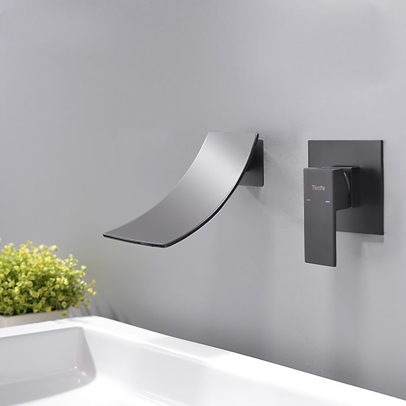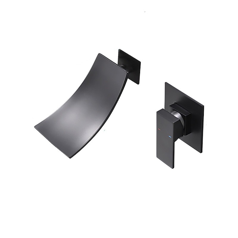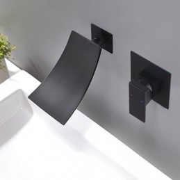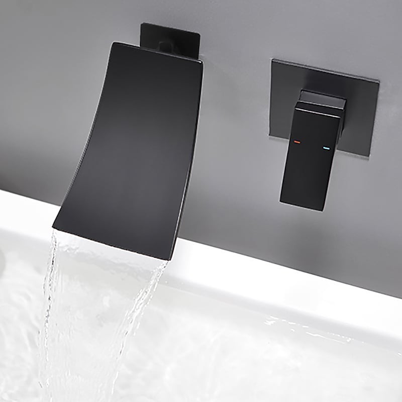 Style: Contemporary, Features: Wall Mount, Waterfall, Faucet Type: Bathroom Sink Faucet, Installation Type: Wall Mounted, Number Of Handles: Single Handle, Cold and Hot Switch: Yes, Valve Type: Ceramic Valve, Finish: Black, Installation Holes and Handles: Single Handle Two Holes,