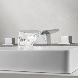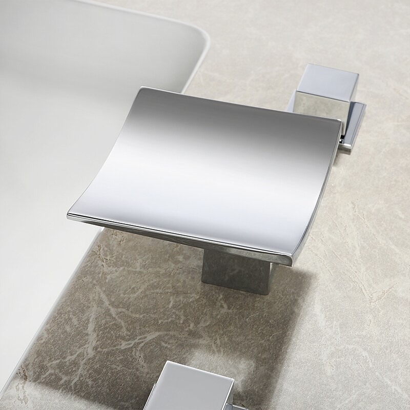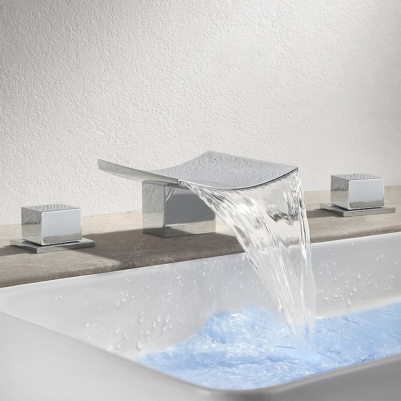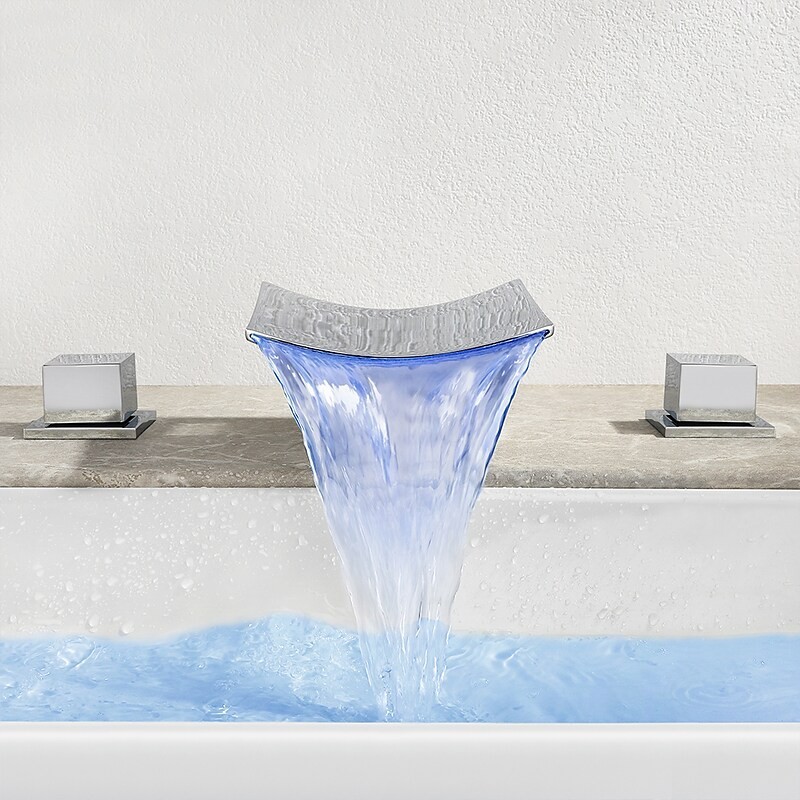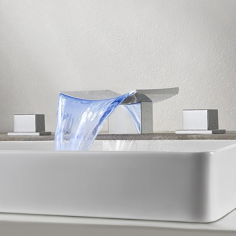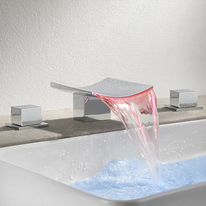 Type: Bathroom Sink Faucet+ Accessories, Style: Modern Contemporary, Features: LED, Widespread, Waterfall, Faucet Type: Bathroom Sink Faucet, Installation Type: Widespread, Number Of Handles: Two Handles, Cold and Hot Switch: Yes, Valve Type: Ceramic Valve, Finish: Chrome, Installation Holes and Handles: Two Handles Three Holes,