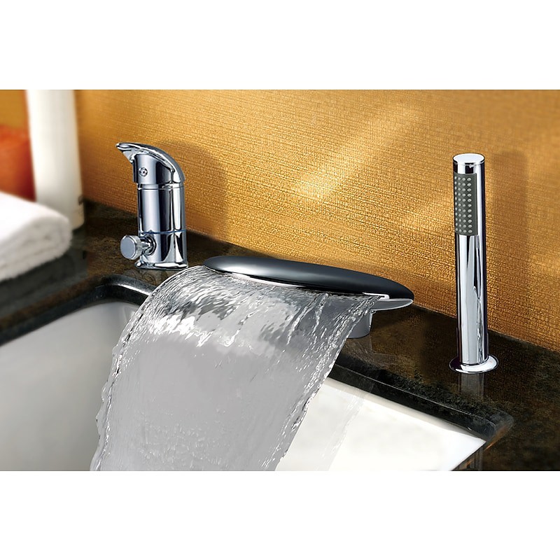 Style: Contemporary, Features: Waterfall, Faucet Type: Bathtub Faucet, Installation Type: Roman Tub, Number Of Handles: Single Handle, Valve Type: Ceramic Valve, Finish: Chrome, Installation Holes and Handles: Single Handle Three Holes,