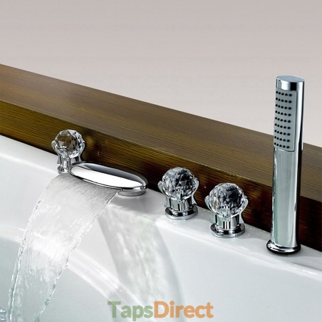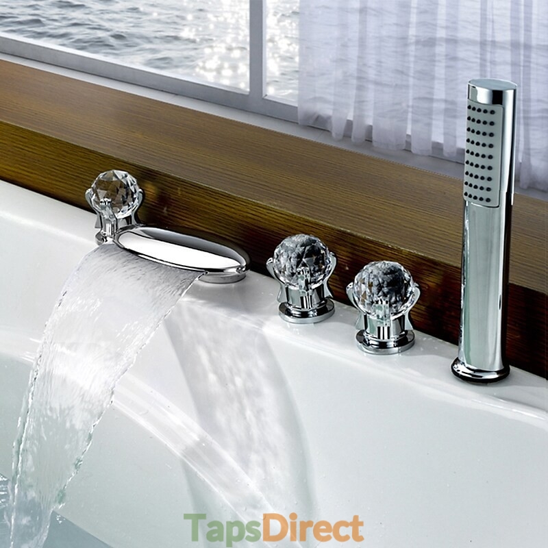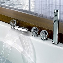 Style: Contemporary, Features: Handshower Included, Waterfall, Faucet Type: Bathtub Faucet, Installation Type: Roman Tub, Number Of Handles: Three Handles, Cold and Hot Switch: Yes, Valve Type: Brass Valve, Finish: Chrome, Installation Holes and Handles: Three Handles Five Holes,