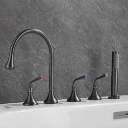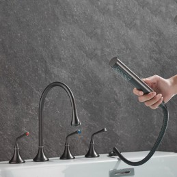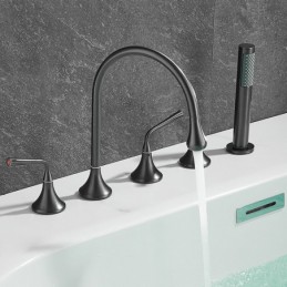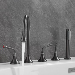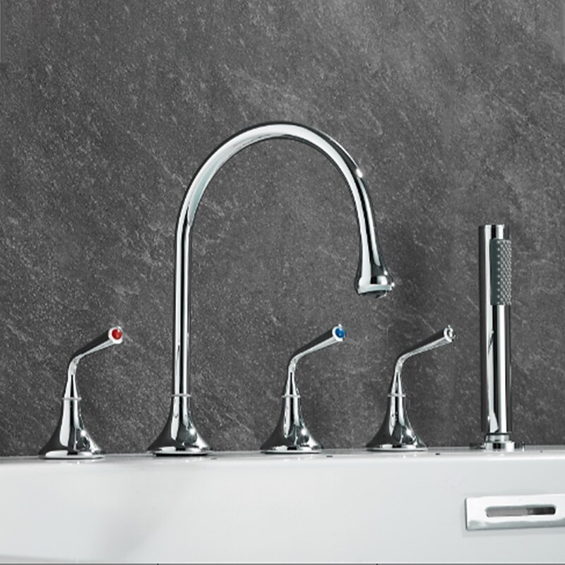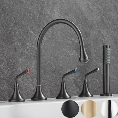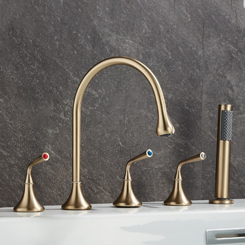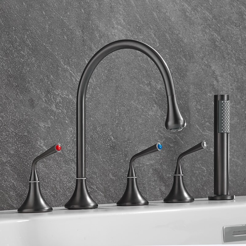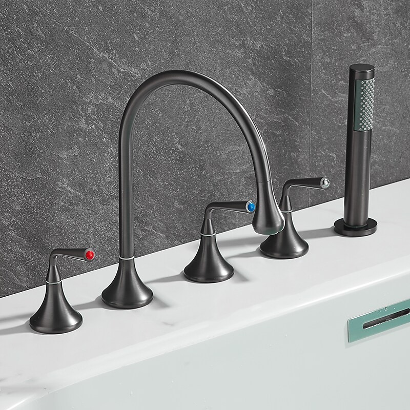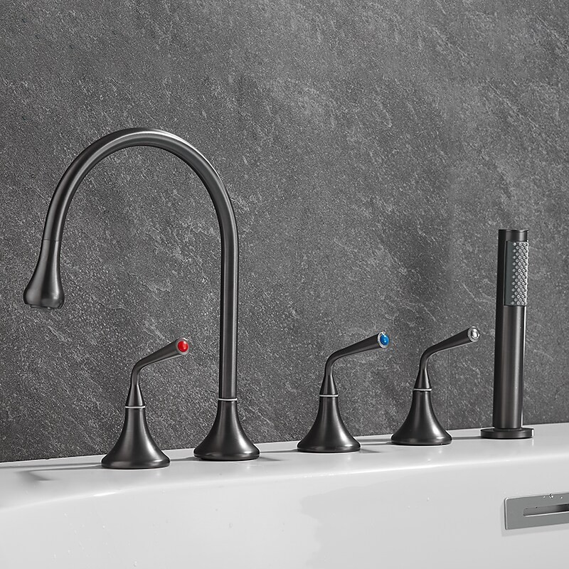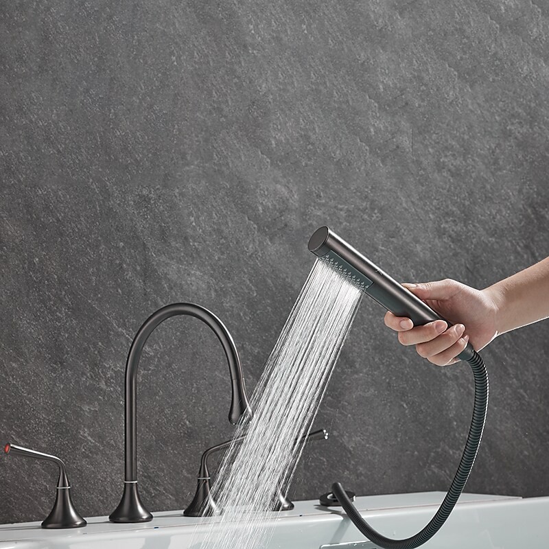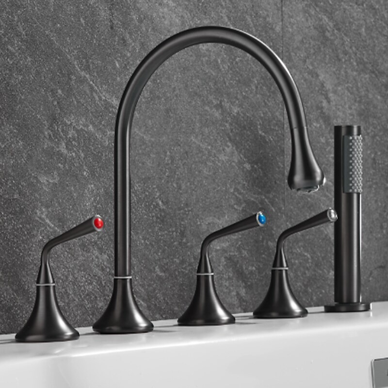 Style: Modern Contemporary, Contemporary, Features: Handshower Included, Pullout Spray, Pull out, Widespread, Faucet Type: Bathtub Faucet, Installation Type: Roman Tub, Number Of Handles: Three Handles, Cold and Hot Switch: Yes, Valve Type: Brass Valve, Finish: Painted Finishes, Electroplated, Installation Holes and Handles: Three Handles Five Holes, Water Pressure (Mpa): 0.3-1,