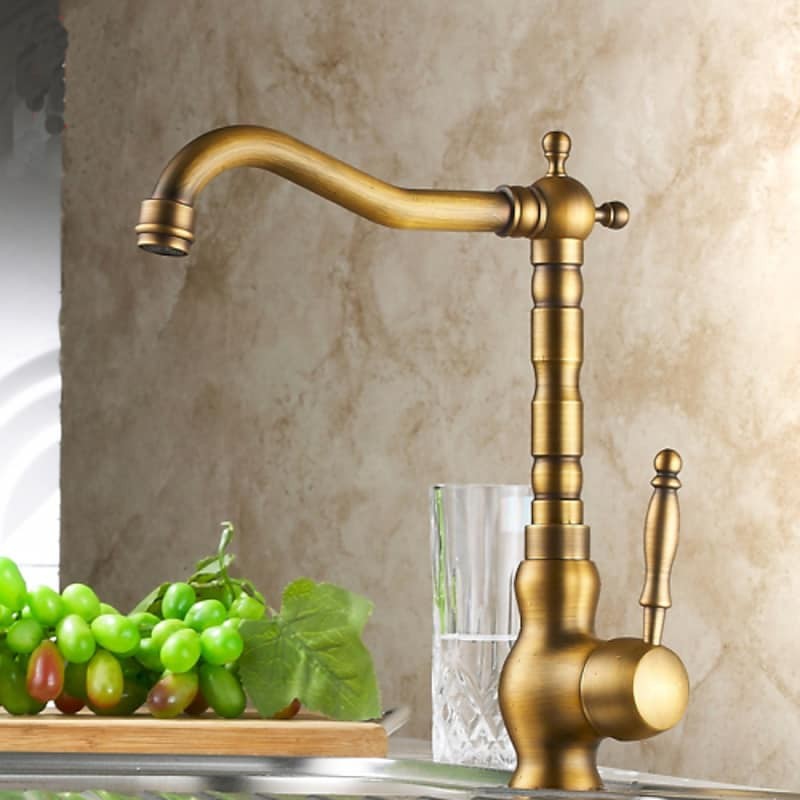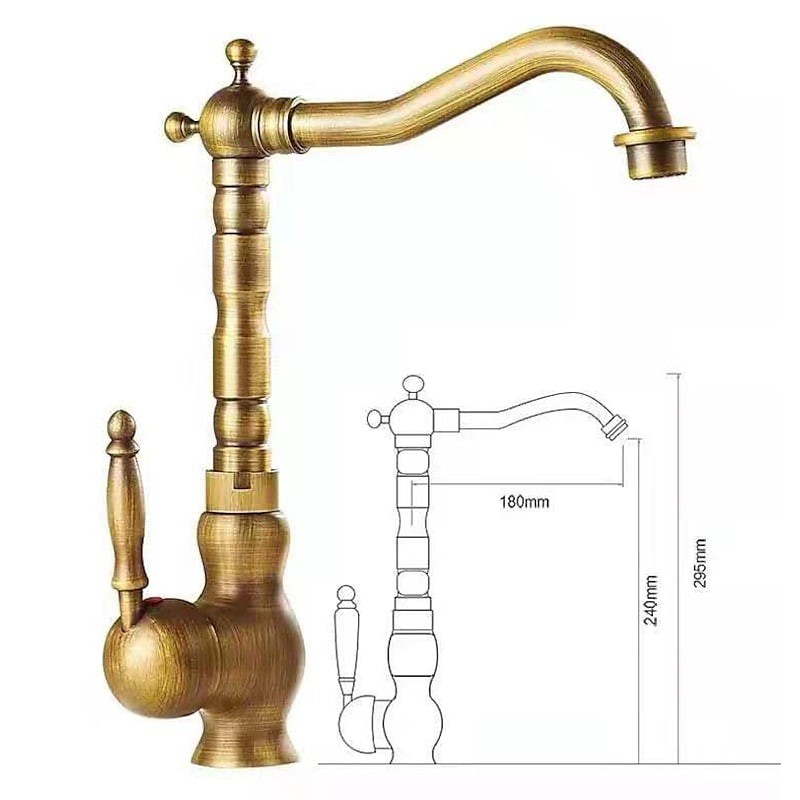 Type: Standard Spout, Style: Contemporary, Features: Rotatable, Faucet Type: Kitchen faucet, Installation Type: Deck Mounted, Number Of Handles: Single Handle, Flow Rate (L/min): #(1.8 GPM (6.81 L/min)), Cold and Hot Switch: Yes, Valve Type: Ceramic Valve, Finish: Antique Brass, Installation Holes and Handles: One Hole, Single Handle One Hole,