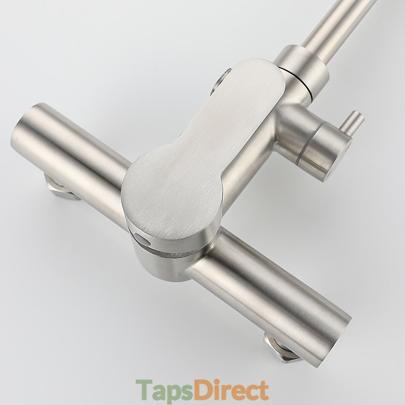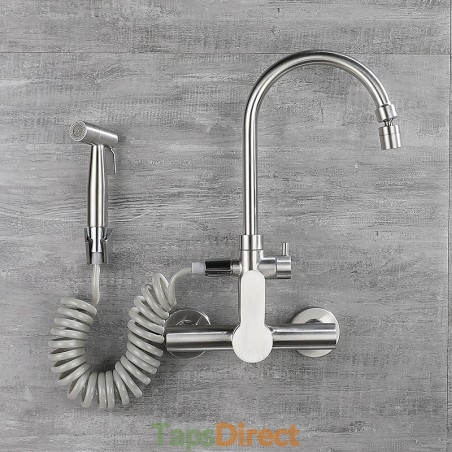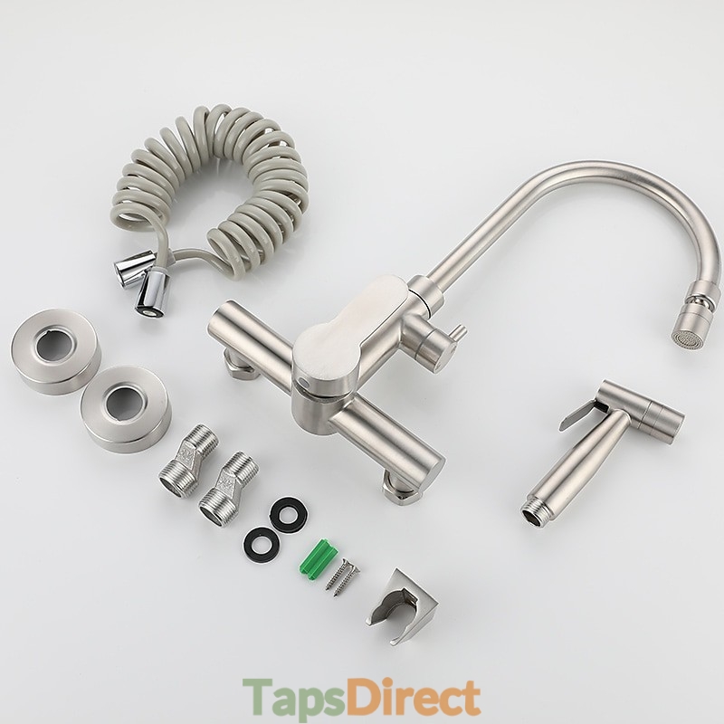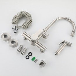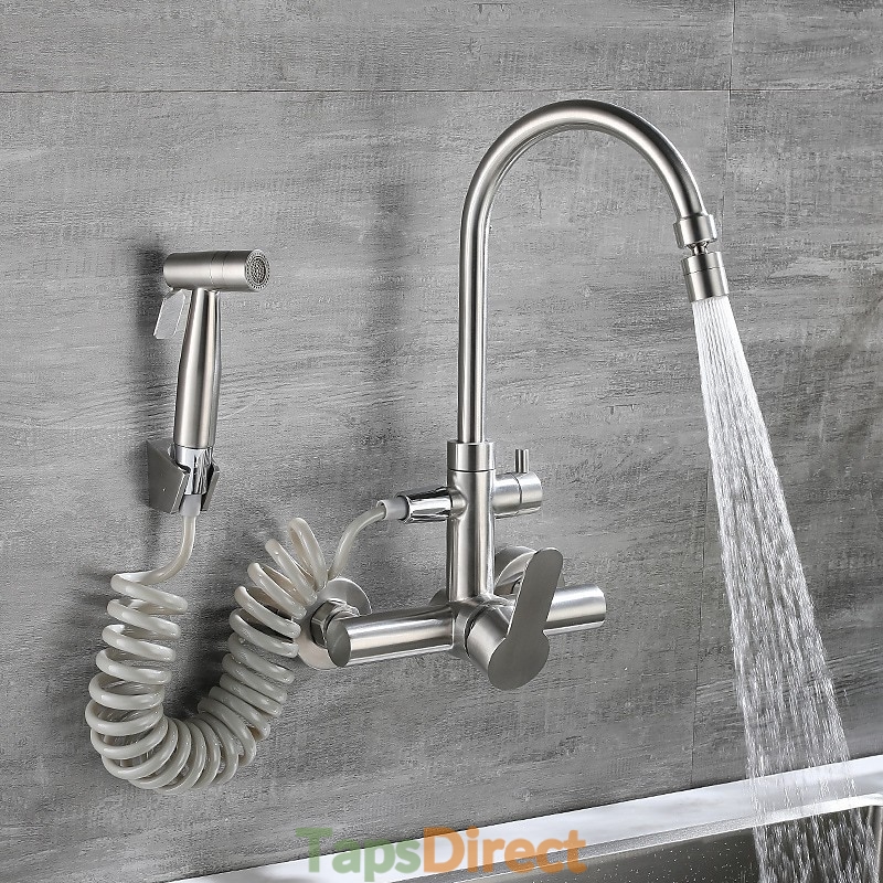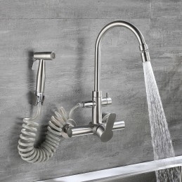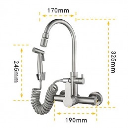 Type: Standard Spout, Style: Modern Contemporary, Features: Multi-function, Foldable, Faucet Type: Kitchen faucet, Installation Type: Wall Mounted, Cold and Hot Switch: Yes, Valve Type: Ceramic Valve, Finish: Stainless Steel, Installation Holes and Handles: Single Handle Two Holes,