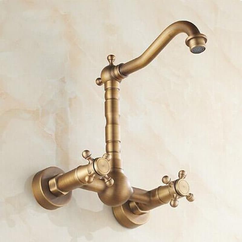 Type: Standard Spout, Style: Antique, Features: Rotatable, Multi-function, Faucet Type: Kitchen faucet, Installation Type: Wall Mounted, Number Of Handles: Two Handles, Flow Rate (L/min): #(2 GPM (7.57 L/min)), Cold and Hot Switch: Yes, Valve Type: Brass Valve, Finish: Antique Brass, Suitable Rooms: Kitchen, Installation Holes and Handles: Two Handles Two Holes, Water Pressure (Mpa): 0.5-1,