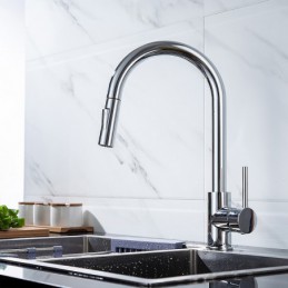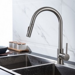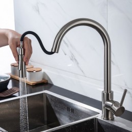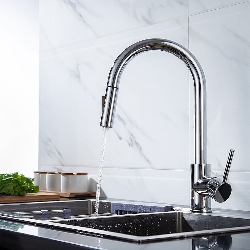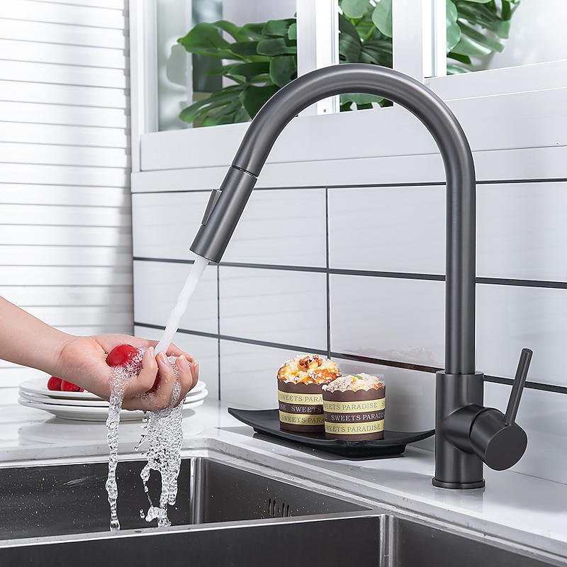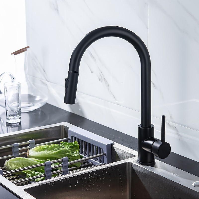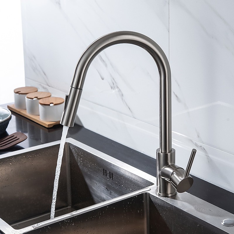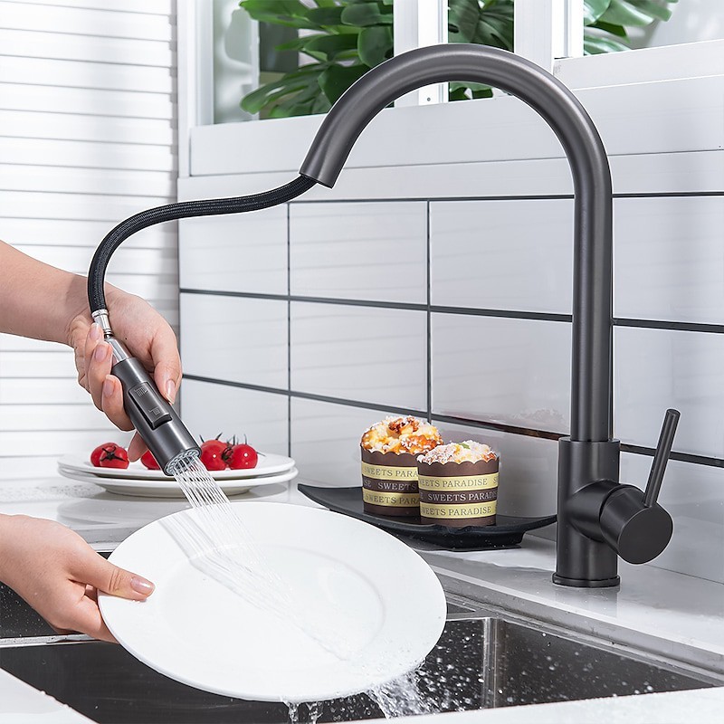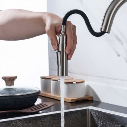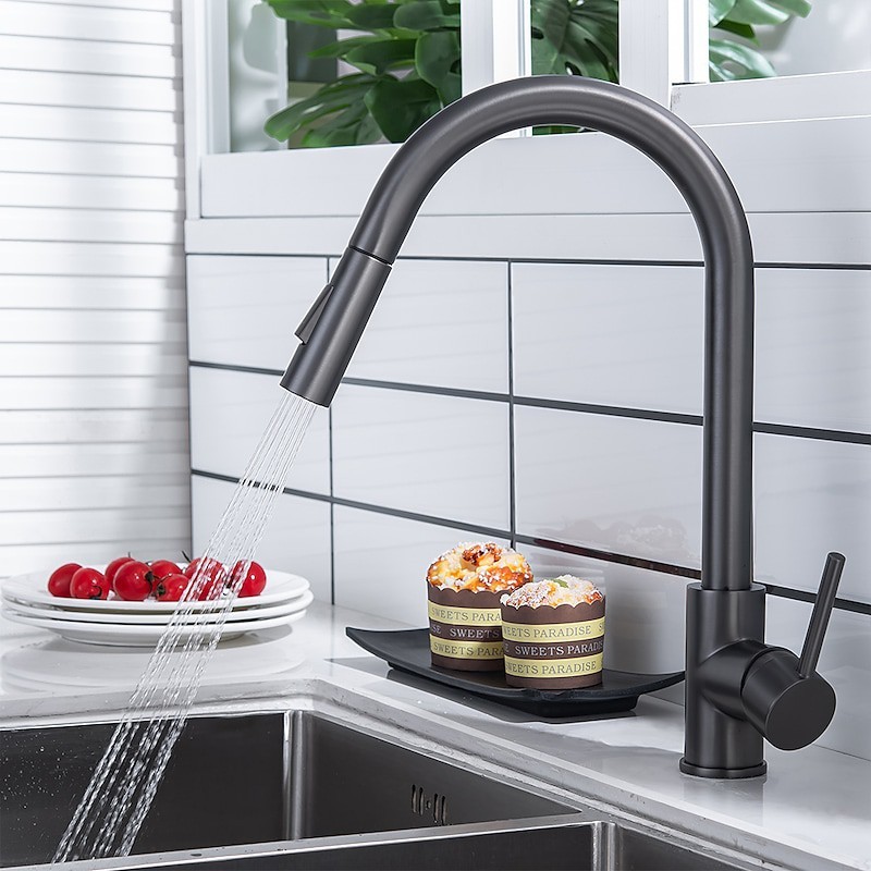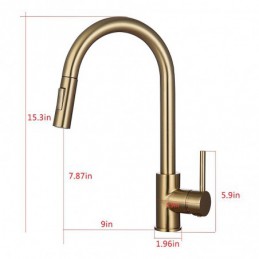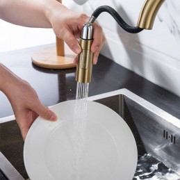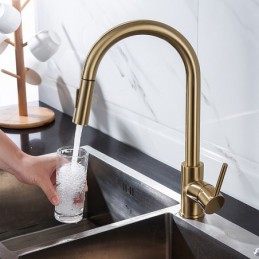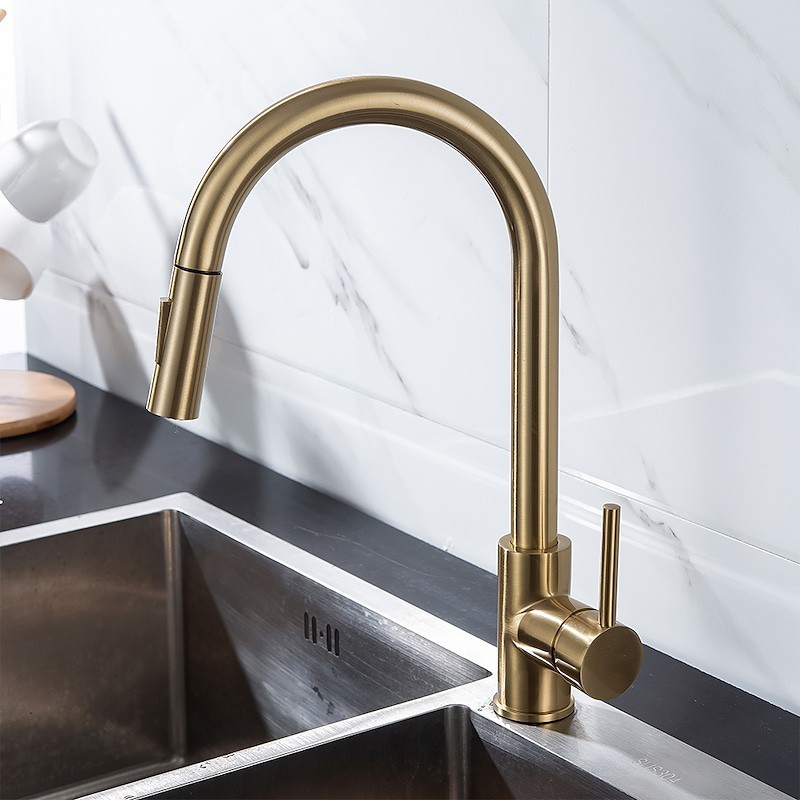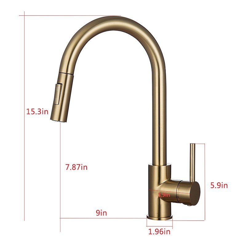 Type: Pull-out / Pull-down, Style: Modern Contemporary, Features: Rotatable, Faucet Type: Kitchen faucet, Installation Type: Centerset, Cold and Hot Switch: Yes, Valve Type: Ceramic Valve, Finish: Brushed Gold, Installation Holes and Handles: Single Handle One Hole,