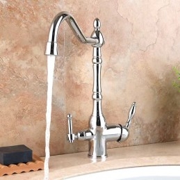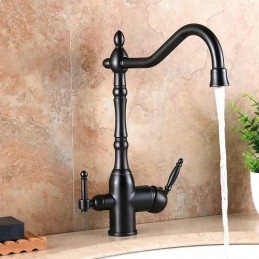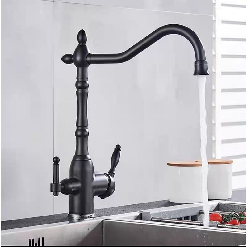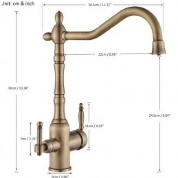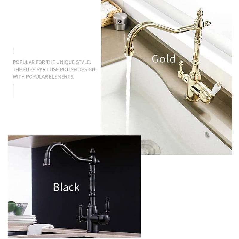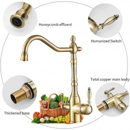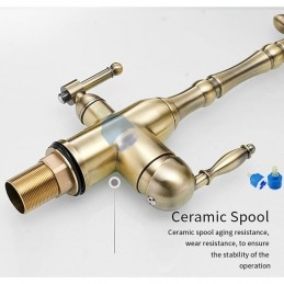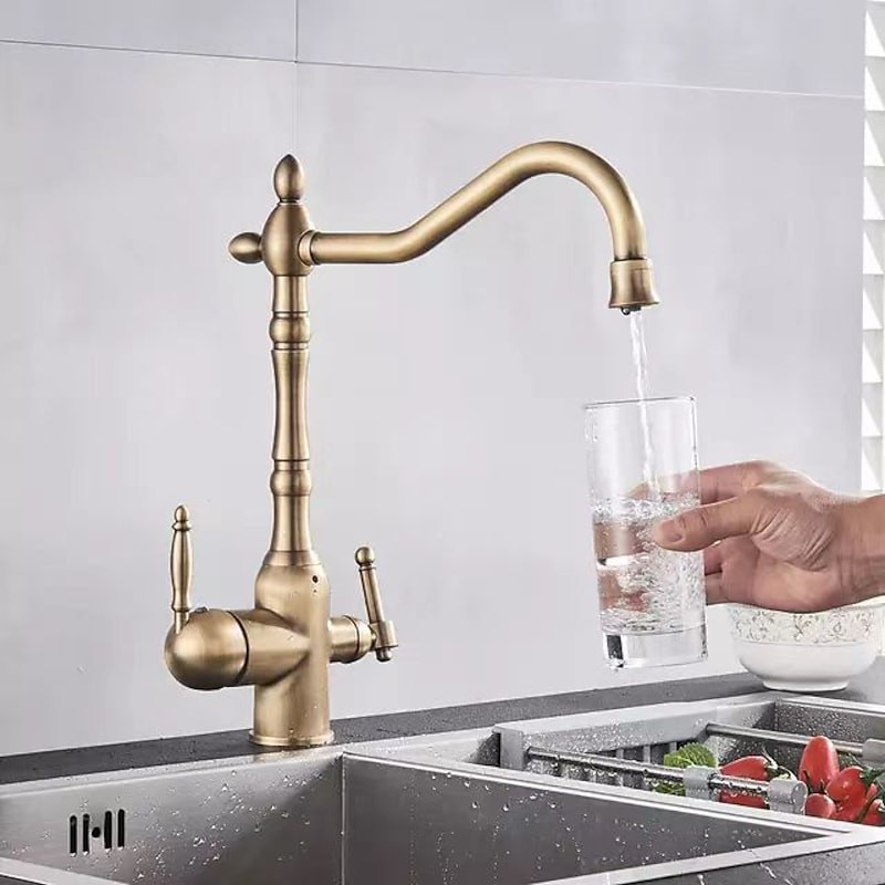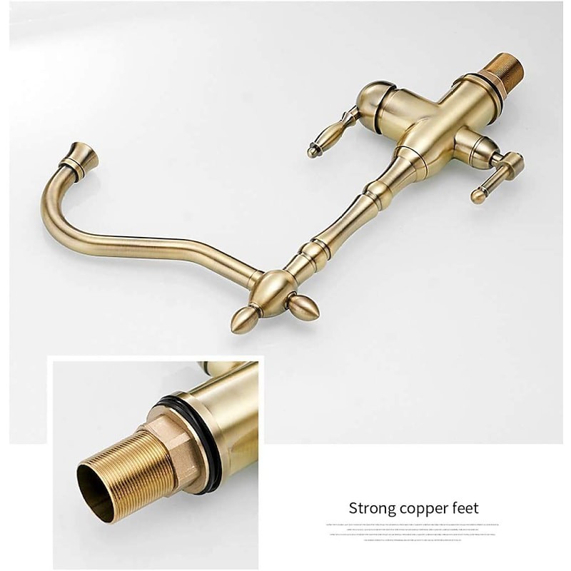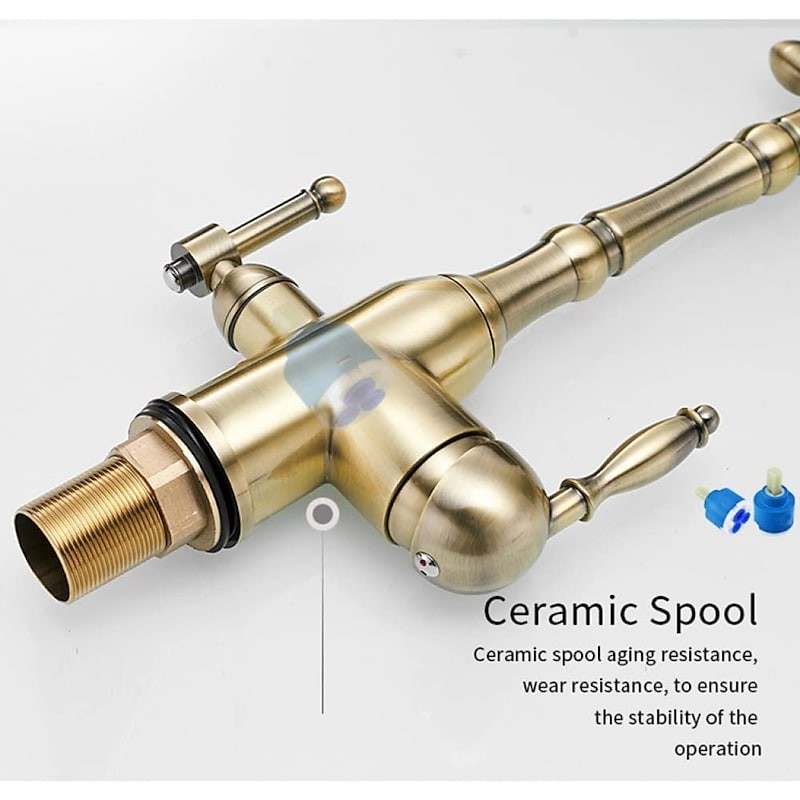 Type: Purified water, Style: Retro Vintage, Features: Multi-function, Faucet Type: Kitchen faucet, Installation Type: Centerset, Valve Type: Ceramic Valve, Finish: Antique Brass, Electroplated, Installation Holes and Handles: Single Handle Two Holes,