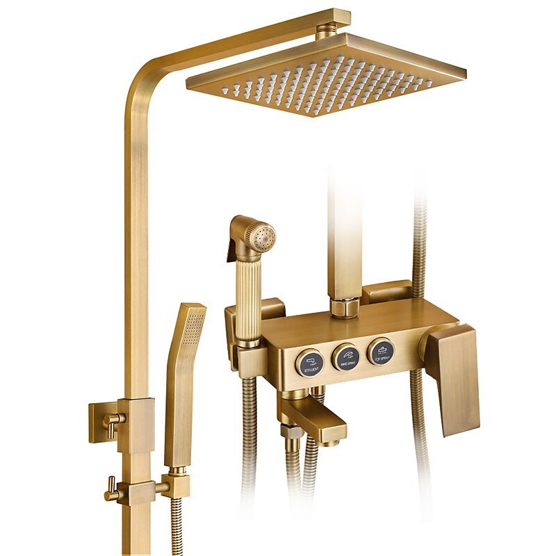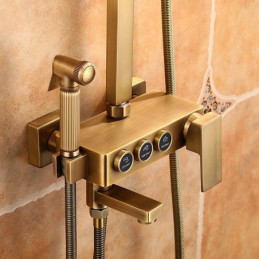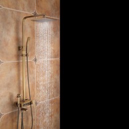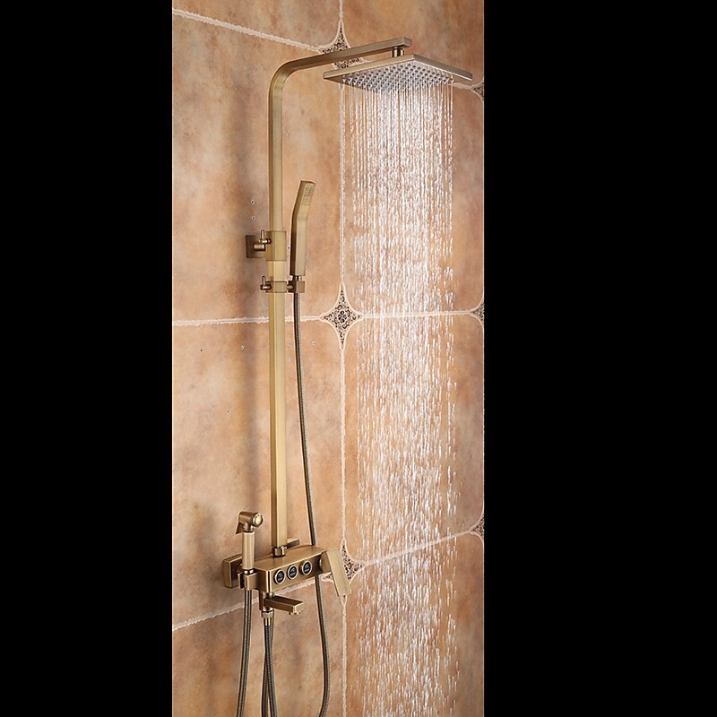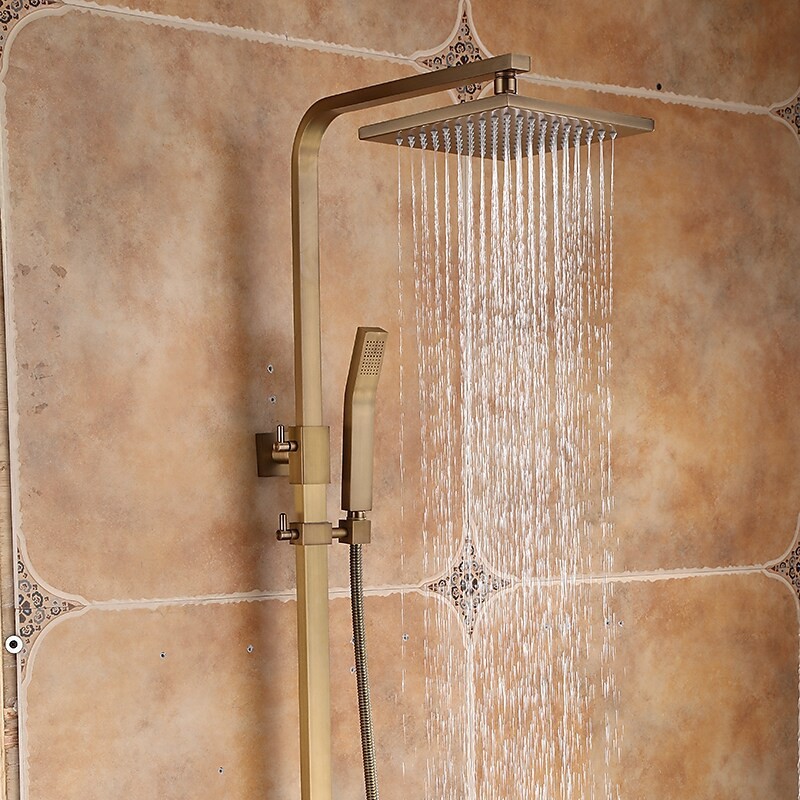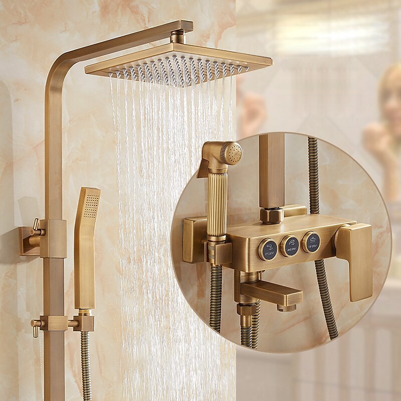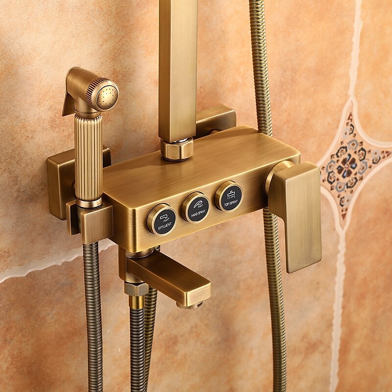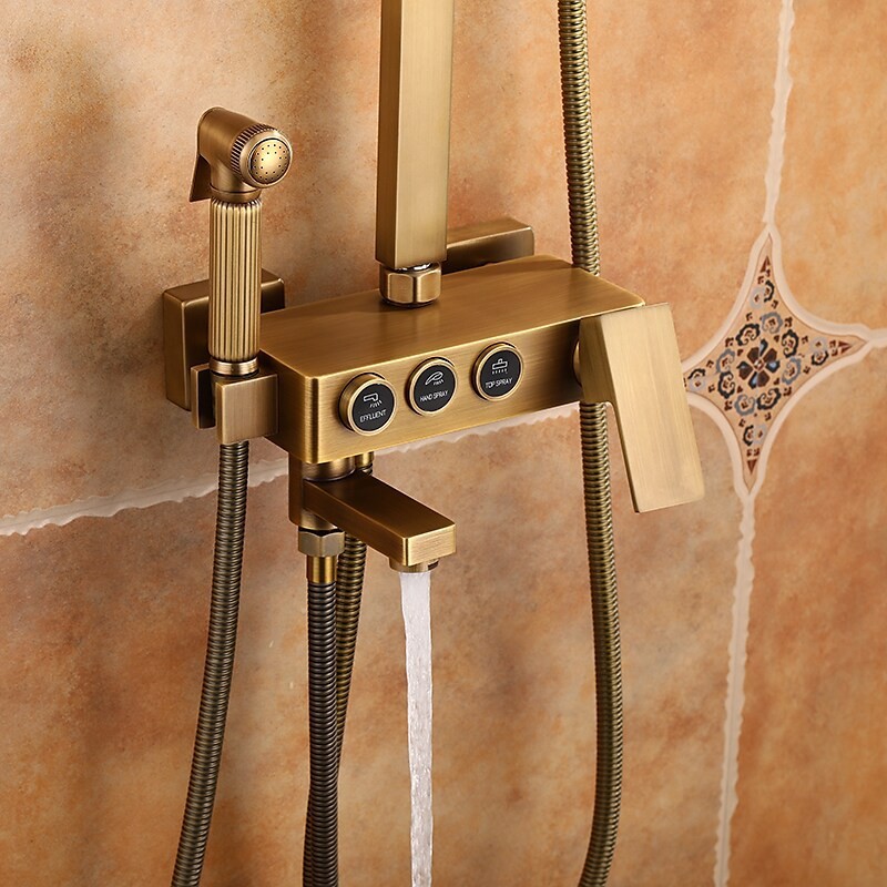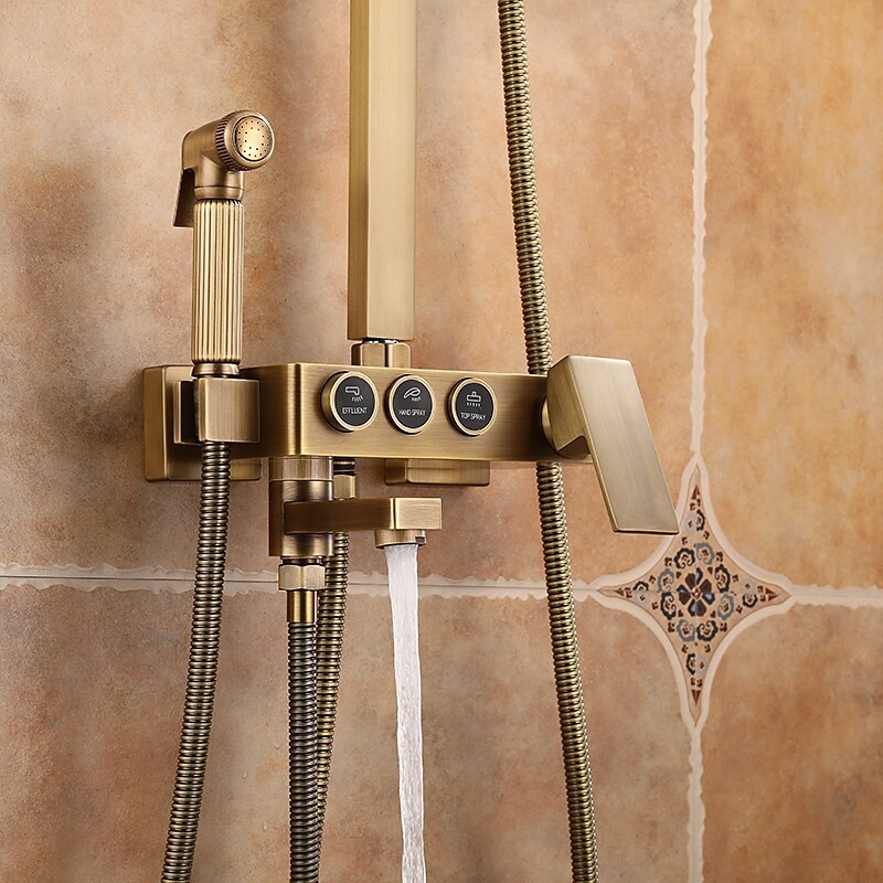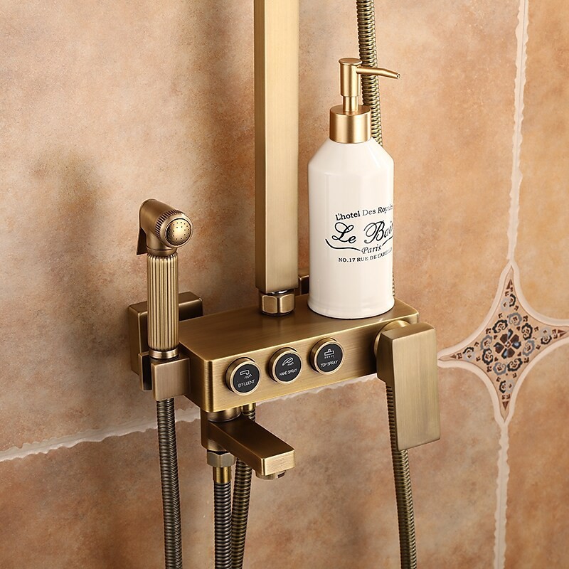 Style: Vintage Style, Traditional, Features: Waterfall, Handshower Included, Faucet Type: Rainfall Shower Head System, Shower System, Installation Type: Mount Outside, Cold and Hot Switch: Yes, Valve Type: Ceramic Valve, Finish: Antique Brass, Special selected products: COD,