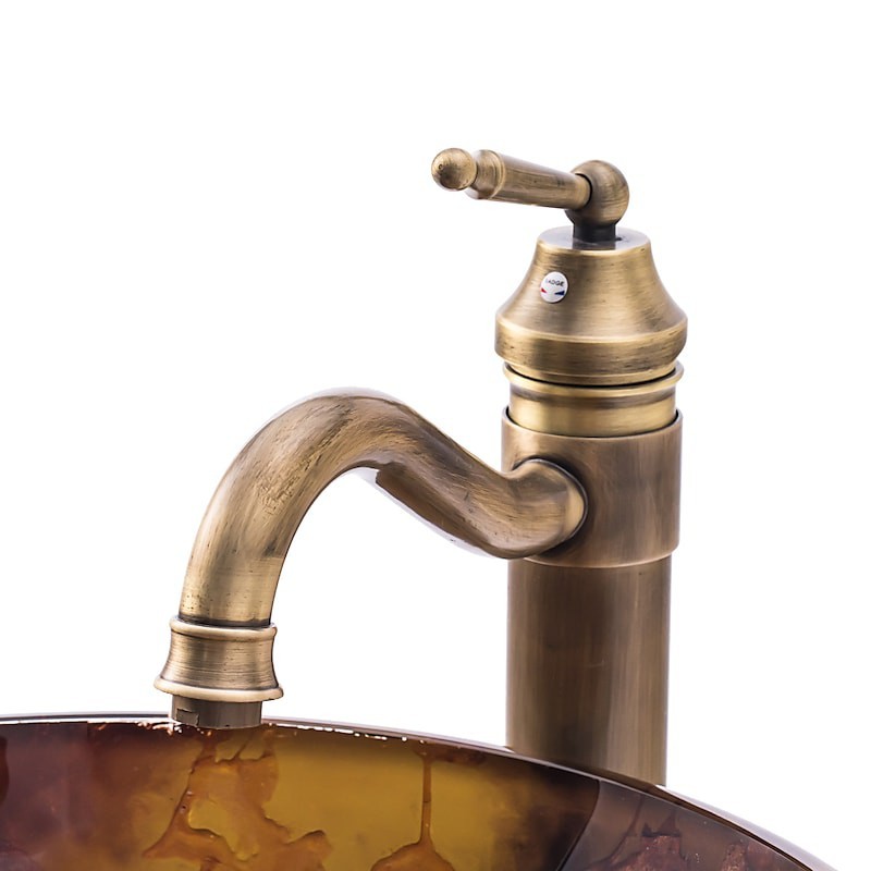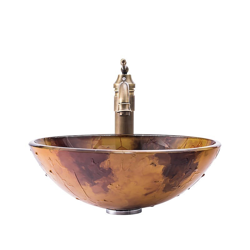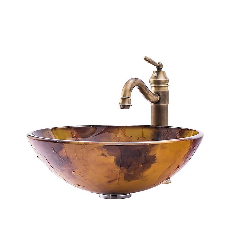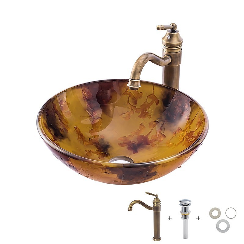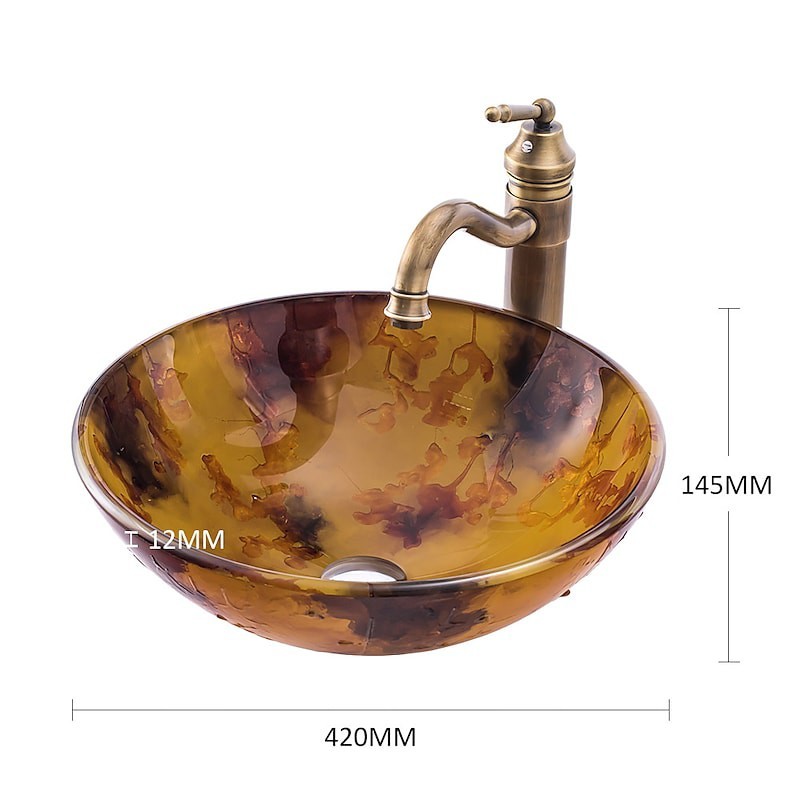 Style: Antique, Sink Finish: Tempered Glass, Faucet Finish: Chrome, Water Drain Finish: Chrome, Mounting Ring Finish: Chrome, Sink Material: Tempered Glass, Mounting Ring Material: Brass, Sink Shape: Round, Faucet Body Material: Zinc Alloy, Net Weight (kg): 9, Shipping Weight (kg): 14.7456, Dimension (cm): 42*42*14.5, What's in the box: Bathroom Mounting Ring, Bathroom Faucet, Bathroom Sink, Bathroom Water Drain,