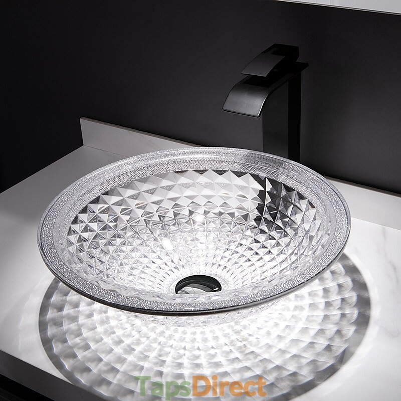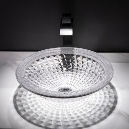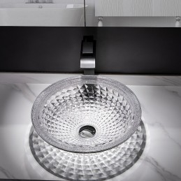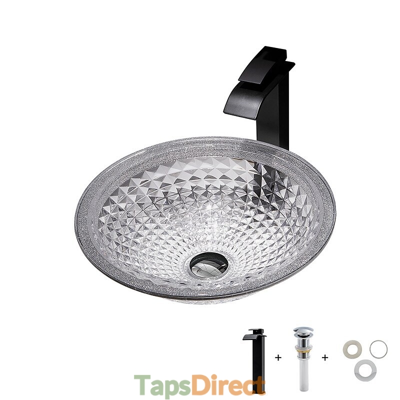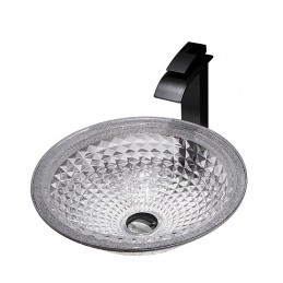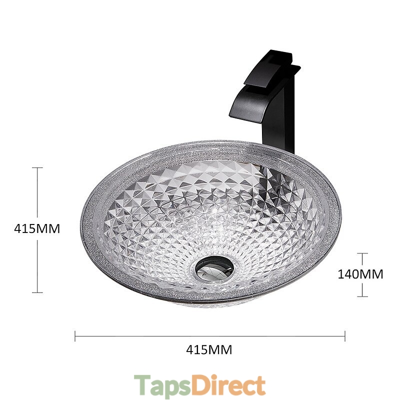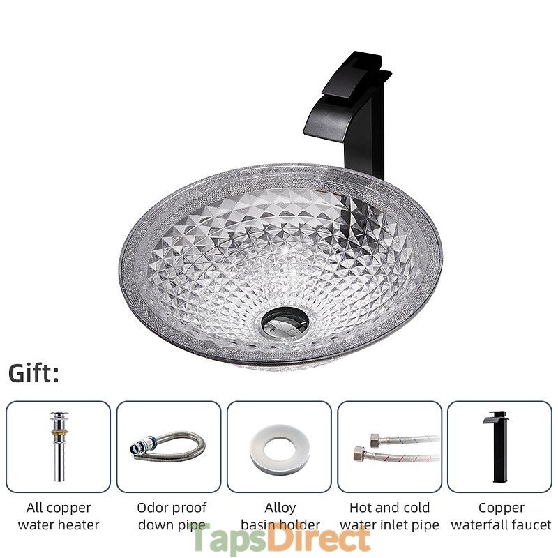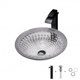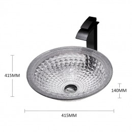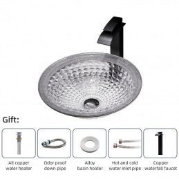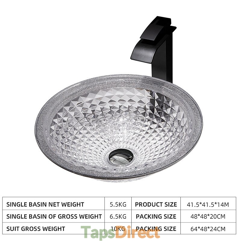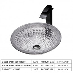 Style:Contemporary,Water Drain Finish:Chrome,Mounting Ring Finish:Chrome,Sink Material:Glass,Water Drain Material:Brass,Mounting Ring Material:Zinc Alloy,Sink Shape:Bowl,Faucet Body Material:Brass,Net Weight (kg):6,Shipping Weight (kg):8,Dimension (cm):41.5*41.5*14,What's in the box:Bathroom Mounting Ring,Bathroom Faucet,Bathroom Sink,Bathroom Water Drain,